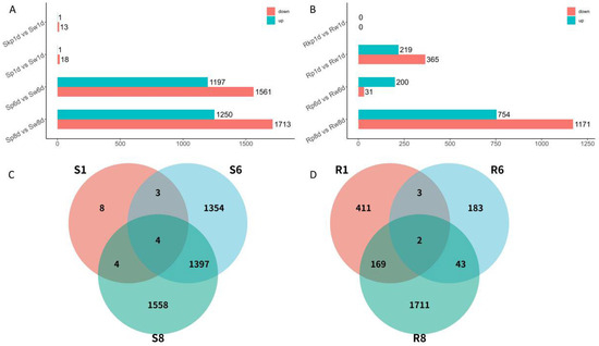 Comparative analysis of pathogen-treated and water-treated samples revealed distinct transcriptional patterns. In cultivar S, 1, 1, 1197, and 1250 upregulated DEGs were identified at 0, 1, 6, and 8 dpi, whereas 13, 18, 1561, and 1713 downregulated DEGs, respectively, were identified at these time points (Figure 2A). In cultivar R, pathogen-challenged plants exhibited 0, 219, 200, and 754 upregulated DEGs and 0, 365, 31, and 1171 downregulated DEGs at 0, 1, 6, and 8 dpi, respectively (Figure 2B).