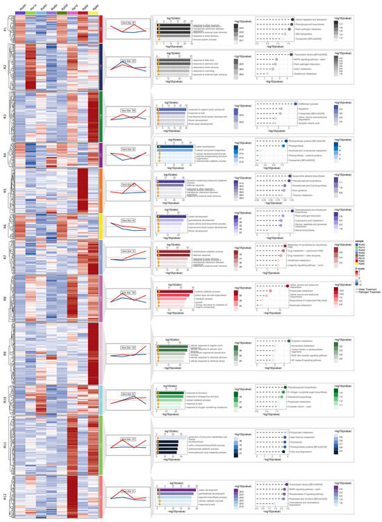 Co-expression cluster identification and functional annotation of DEGs in resistant (R) watermelon upregulated upon inoculation with Fusarium oxysporum f.sp. niveum (Fon). The Rw0d data are the same as the Rp0d data. From left to right are expression calorimetric maps, expression trend maps and the number of genes contained, GO enrichment results, and KEGG pathway enrichment results. R: FW-resistant watermelon variety PI 296341, w: water treatment, p: pathogen treatment (Fusarium oxysporum f. sp. niveum race 1). In expression calorimetric maps, red indicates upregulation and blue indicates downregulation, with white representing baseline expression (z-score normalized), and R1–R12 denote the 12 gene clusters obtained. In expression trend maps, the red line represents data from the pathogen treatment, the blue line represents data from the water treatment, and trend lines denote mean expression values per cluster. In the GO enrichment results, the top 5 enriched terms in Biological Process (BP) are shown. In the KEGG pathway enrichment results, the top 5 most significant terms from the KEGG enrichment analysis are shown.