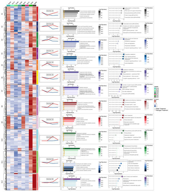 Co-expression cluster identification and functional annotation of DEGs in susceptible (S) watermelon upregulated upon inoculation with Fusarium oxysporum f.sp. niveum (Fon). The Sw0d data are the same as the Sp0d data. From left to right are expression calorimetric maps, expression trend maps and the number of genes contained, GO enrichment results, and KEGG pathway enrichment results. S: FW-susceptible watermelon variety W1-1, w: water treatment, p: pathogen treatment (Fusarium oxysporum f. sp. niveum race 1). In expression calorimetric maps, red indicates upregulation and blue indicates downregulation, with white representing baseline expression (z-score normalized), and S1–S12 denote the 12 gene clusters obtained. In expression trend maps, the red line represents data from the pathogen treatment, the blue line represents data from the water treatment, and trend lines denote mean expression values per cluster. In the GO enrichment results, the top 5 enriched terms in Biological Process (BP) are shown. In the KEGG pathway enrichment results, the top 5 most significant terms from the KEGG enrichment analysis are shown.