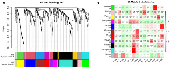 Co-expression network analysis of DEGs and the module–trait relationship in response to Fusarium oxysporum f.sp. niveum (Fon) infection of watermelon. (A) Cluster dendrogram of different genes in co-expression modules. Dynamic tree cut (minimum module size = 30 genes, merge cut height = 0.25). Color bars below the dendrogram represent assigned modules. SR denotes the data used in WGCNA from susceptible (S) and resistant (R) watermelon. (B) Heat map of the correlation between templates and groups. Each row represents a module eigengene, and each column represents a different characteristic. Each cell contains the corresponding correlation and p-value, and the table is color coded by correlation according to the color legend. The number below each module name denotes the number of genes within the module. Excluding the gray module, a total of 10 gene modules were identified.