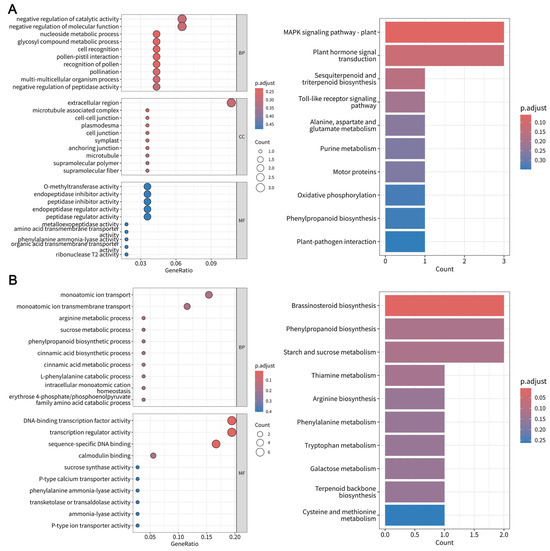 Functional enrichment analysis of key co-expression modules in pathogen-responsive genes in the Fusarium oxysporum f.sp. niveum–watermelon pathosystem. (A) GO and KEGG pathway enrichment analyses of SRgreen module genes. (B) GO and KEGG pathway enrichment analyses of SRblack module genes.