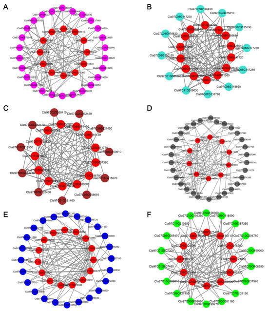Identification of hub genes in the protein–protein interaction (PPI) networks following inoculation of watermelon with Fusarium oxysporum f.sp. niveum. (A) PPI network of SRmagenta. (B) PPI network of SRturquoise. (C) PPI network of SRbrown. (D) PPI network of SRblack. (E) PPI network of SRblue. (F) PPI network of SRgreen.