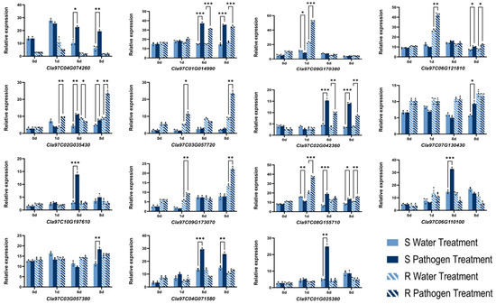 qRT-PCR analysis of 15 hub genes following inoculation of resistant (R) and susceptible (S) watermelon with Fusarium oxysporum f.sp. niveum. Error bars indicate the mean ± standard deviation, and the three data points in each column indicate three biological replicates. * p < 0.05, ** p < 0.01, *** p < 0.001.