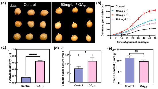 To investigate the regulatory effect of GA4+7 on seed germination of P. cyrtonema, experiments were conducted using GA4+7 solutions at different concentrations. After 56 days of cultivation, the germination rates of the control group, 10 mg·L−1, 50 mg·L−1, and 100 mg·L−1 treatment groups were 23.33%, 52.67%, 84.33%, and 41%, respectively. Among these, the 50 mg·L−1 GA4+7 treatment group achieved the highest germination rate, showing a 61% increase compared to the control group, thus identifying 50 mg·L−1 as the optimal treatment concentration (Figure 1a,b). To further elucidate the physiological regulatory mechanism of GA4+7, this study compared key physiological indices between the control group and the 50 mg·L−1 treatment group. The results showed that the 50 mg·L−1 GA4+7 treatment significantly increased the soluble sugar content and α-amylase activity in the seeds but decreased the pectin content (Figure 1c–e).