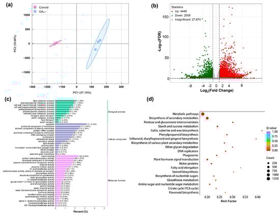 To analyze the molecular mechanism underlying the breaking of seed dormancy in P. cyrtonema under exogenous GA4+7 treatment, high-throughput RNA sequencing was performed on the control group and 50 mg·L−1 GA4+7-treated seeds with three biological replicates. A total of 41.06 Gb of clean data was obtained, with the error rate in each sample not exceeding 0.02%, a value much lower than the 1% sequencing error rate per base position. The Q30 values of the sequenced samples were all higher than 95%, and the Guanine–Cytosine content ranged from 48.29% to 49.26%, indicating that the sequencing data for each sample was of high quality (Table S2). Principal component analysis (PCA) revealed significant separation between the treatments, with PC1 and PC2 accounting for 37.15% and 18.66% of the total variance, respectively (Figure 2a). The transcriptome sequencing data of CK and GA4+7 treatment groups were compared, and genes with log2 Fold Change ≥ 1 and FDR < 0.05 were identified as differentially expressed. The results revealed a total of 7106 differentially expressed genes in the P. cyrtonema seed transcriptome, of which 4448 genes were up-regulated and 2658 genes were down-regulated (Figure 2b). Gene Ontology (GO) analysis revealed that differentially expressed genes were primarily enriched in biological processes, followed by molecular function and cellular components (Figure 2c). Within biological processes, the main enrichments were observed in the lipid catabolic process, phenylpropanoid metabolic process, cell wall polysaccharide metabolic process, cell wall macromolecule metabolic process, hemicellulose metabolic process, polysaccharide catabolic process, and pectin catabolic process, which are primarily related to cell wall metabolism. In molecular function, the main enrichments were in heme binding, protein heterodimerization activity, structural constituent of chromatin, passive transmembrane transporter activity, channel activity, and enzyme inhibitor activity, which are mainly related to protein binding and enzyme activity. In cellular components, the main enrichments were observed in processes such as apoplast, anchored component of the membrane, intrinsic component of plasma membrane, anchored component of the plasma membrane, and protein–DNA complex. Kyoto Encyclopedia of Genes and Genomes (KEGG) pathway analysis revealed that these DEGs were primarily involved in pentose and glucuronate interconversions, starch and sucrose metabolism, cutin, suberine, and wax biosynthesis, plant hormone signal transduction, and other pathways (Figure 2d).