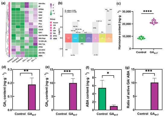 Transcriptomic analysis demonstrated that exogenous GA4+7 application upregulated genes associated with phytohormone biosynthesis and signal transduction pathways in P. cyrtonema seeds. Consequently, a comprehensive analysis of hormone metabolomes was conducted in GA4+7-treated P. cyrtonema seeds. Our analysis identified 19 differentially accumulated hormone metabolites (Figure 3a, Table S3), with 15 showing increased abundance and 4 exhibiting decreased levels (Figure 3b). Meanwhile, the total amount of hormones after treatment with exogenous GA4+7 increased 2.49-fold compared to the control group (Figure 3c). In plants, gibberellin A1 (GA1) and gibberellin A4 (GA4) are the most active gibberellins, while ABA is involved in regulating seed dormancy. Hormone metabolomics analysis showed that after exogenous GA4+7 treatment, the content of GA1 and GA4 in seeds significantly increased (Figure 3d,e), and the content of ABA significantly decreased (Figure 3f). Therefore, the active GA/ABA ratio showed a significant increase compared with the control group (Figure 3g).