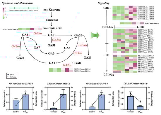 Changes in DEGs in GA biosynthesis and signal transduction pathways, and qRT-PCR validation of major genes in the pathway. Red indicates that the gene encoding the substance is up-regulated.