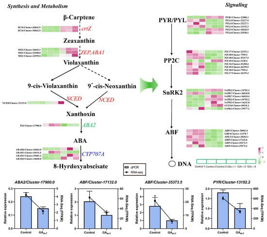 In the ABA biosynthesis pathway, three genes encoding zeaxanthin epoxide (ZEP) and one gene encoding 9-cis-epoxy carotenoid dioxygenase (NCED) were upregulated, while one gene encoding short-chain dehydrogenase (ABA2) was downregulated. Additionally, three genes encoding cytochrome P450 type enzymes (CYP707A) were upregulated. Regarding the ABA signal transduction pathway, three genes encoding ABA receptors (pyrabactin resistance 1/PYR1-like, PYR1/PYL) were upregulated, whereas seven genes encoding protein phosphatases 2C (PP2C) and two genes encoding SNF1-related protein kinase 2 (SnRK2) were downregulated. These changes ultimately led to the downregulation of six genes encoding ABRE-binding factors (ABFs), among which three were identified as ABI5 genes (Figure 5, Table S5). qRT-PCR validation was conducted for four pathway genes: ABA2/Cluster-17900.0, ABF/Cluster-17132.0, ABF/Cluster-35373.5, and PYR/Cluster-13192. The overall results were consistent with the RNA-seq (FPKM) expression trends.