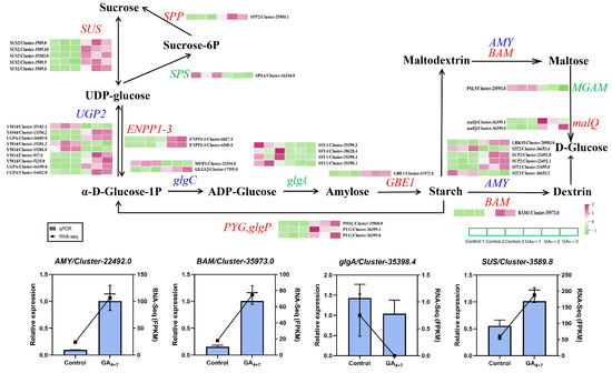 Transcriptomic analysis of P. cyrtonema seeds under exogenous GA4+7 treatment shows remarkable changes in sucrose and starch metabolism-related genes. Among them, 39 related genes were identified(Figure 6, Table S6), including four genes encoding alpha-amylase (AMY), five genes encoding sucrose synthase (SUS), six genes encoding UTP-glucose-1-phosphate uridylyltransferase (UGP2), three genes encoding glycogen phosphorylase (PYG), two genes encoding ectonucleotide pyrophosphatase/phosphodiesterase family member 1/3 (ENPP1-3), one gene encodingsucrose-6-phosphatase (SPP), one gene encoding 1,4-alpha-glucan branching enzyme (GBE1), one gene encoding beta-amylase (BAM), two genes encoding 4-alpha-glucanotransferase (malQ), one gene encoding sucrose-6-phosphatase (SPP), and one gene encoding glucose-1-phosphate adenylyltransferase (glgC). One gene encoding sucrose-phosphate synthase (SPS), four genes encoding starch synthases (SSs), one gene encoding maltase-glucoamylase (MGAM), three genes encoding UGP2, and two genes encoding AMY genes were down-regulated. qRT-PCR validation was conducted for four pathway genes: AMY/Cluster-22492.0, BAM/Cluster-35973.0, SUS/Cluster-3589.8, and glgA/Cluster-35398.4. The overall results were consistent with the RNA-seq (FPKM) expression trends.