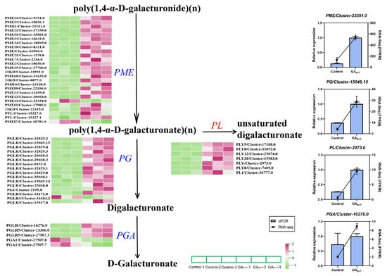 Transcriptome data showed that 54 genes were changed during the pectin catabolic process, including 24 genes encoding pectin methylesterase (PME), 15 genes encoding polygalacturonase (PG), 3 genes encoding 1, 4-alpha-galacturonase (PGA), and 7 genes encoding pectin lyase (PL). Two genes encoding PME, one encoding PG, and three encoding PGA were down-regulated (Figure 7, Table S7). qRT-PCR validation was conducted for four pathway genes: PME/Cluster-23591.0, PG/Cluster-15045.15, PL/Cluster-2973.0, and PGA/Cluster-16276.0. The expression patterns were found to be consistent with the RNA-seq (FPKM) profiles.