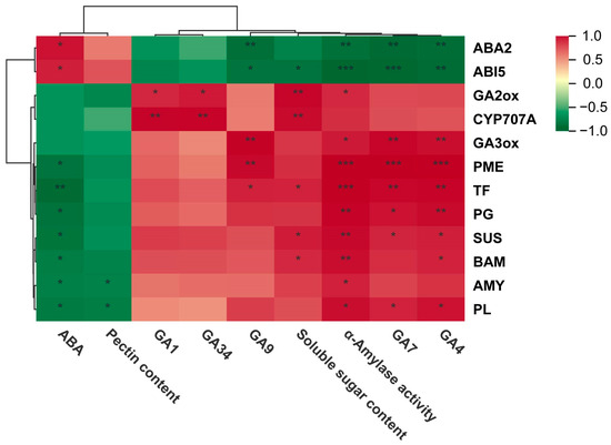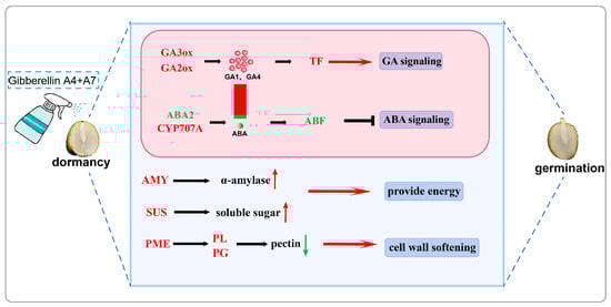 Correlation analyses clarified the relationship between substance metabolism levels and gene expression in seeds treated with exogenous GA4+7. The results showed that GA1 content exhibited a significant positive correlation with the expression changes in the CYP707A gene. The levels of GA4 and GA7 were significantly positively correlated with the expression of the GA3ox gene but significantly negatively correlated with the expression of ABA2 and ABI5. Soluble sugar content and α-amylase activity showed significant positive correlations with the expression of the SUS and BAM genes. Pectin content was significantly positively correlated with the expression of the PL gene and the AMY gene. In addition, the levels of GA4, GA7, and α-amylase activity were highly significantly positively correlated with the expression of the PME gene. All these results confirmed that exogenous GA4+7 promotes seed germination by coordinately regulating the dynamic balance between gibberellin synthesis-related genes and abscisic acid metabolism-related genes, while activating the expression network of starch metabolism and cell wall degradation-related genes, thereby promoting seed germination (Figure 8).