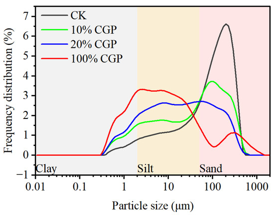 The particle distribution curves of different materials are shown in Figure 1. The particle size of the original aeolian sandy soil (CK) was predominantly greater than 50 μm, presenting a frequency distribution curve with a narrow peak shape. In contrast, the particle size of CGP was distributed over a wide range (0.3–100 μm), with a gentle and broad peak between 2 and 10 μm (Figure 1). After applying CGP to the aeolian sandy soil, the frequency distribution curve transformed from a sharp peak to a smooth one. Meanwhile, the content of coarse particles decreased, while that of fine particles increased. With application rates of 10% and 20% CGP, the soil texture changed from sandy loam to loam and silty loam.