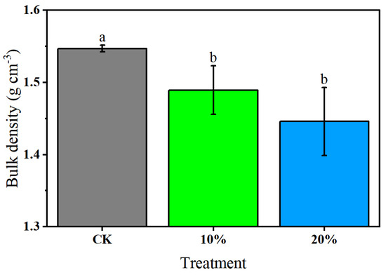 Figure 2. Soil bulk density of different treatments. Different lowercase letters indicate a significant difference between means at p < 0.05.