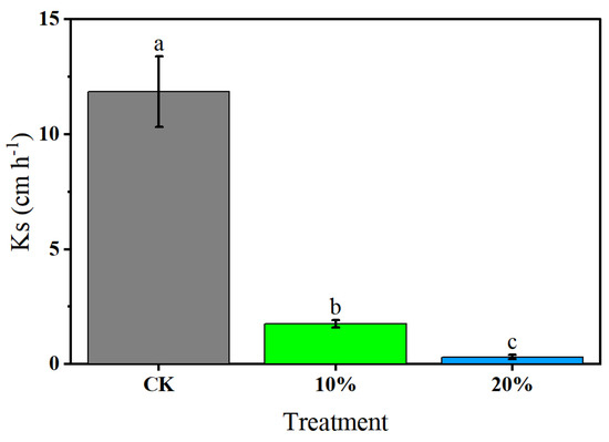 The hydraulic conductivity (Ks) of the saturated soil was changed by the addition of CGP (Figure 3). The Ks of the original soil (CK) was relatively high, reaching 11.85 ± 1.53 cm h−1, which indicated a strong water infiltration velocity. After adding 10% and 20% of CGP, the Ks values of the soil decreased to 1.76 ± 0.17 cm h−1 and 0.31 ± 0.10 cm h−1, respectively. These results clearly demonstrate that with the addition of CGP, the water infiltration rate decreased significantly.