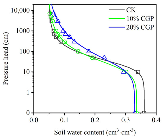 Figure 4. Soil–water retention curves of aeolian sandy soil modified by coal gangue powder (CGP) at different treatments.