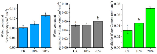 Figure 5. Water availability parameters of aeolian sandy soil modified by coal gangue powder (CGP) at different treatments. For each parameter, different lowercase letters indicate a significant difference between means at p < 0.05.