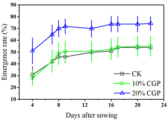 As shown in Figure 6, within 24 days after sowing, the emergence rate of alfalfa seeds increased with the progression of cultivation days. The emergence rates of seeds in the original aeolian sandy soil group (CK) and the 10% CGP treatment group were similar, both around 50%. In contrast, the emergence rate of seeds under the 20% CGP treatment increased significantly (p < 0.05), exceeding 70%.
