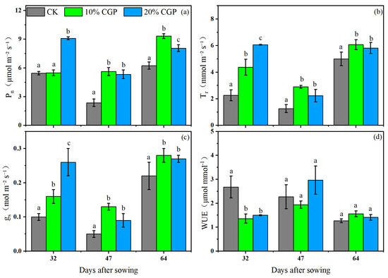The changes in gas exchange parameters during the growth of alfalfa under different treatments are shown in Figure 7. After the application of CGP, the net photosynthetic rate (Pn) and transpiration rate (Tr) of alfalfa increased significantly compared with those of the CK group (Figure 7a,b) (p < 0.05). The variation in stomatal conductance (gs) was consistent with that of Pn and Tr (Figure 7c), indicating that the enhancement of Pn and Tr after CGP application was related to the degree of stomatal opening. However, with the increase in the amount of CGP applied, Pn, Tr, and gs did not continue to rise, suggesting that excessive addition of CGP was not beneficial to plant water metabolism. Additionally, there was no significant difference in water use efficiency (WUE) among different treatments (Figure 7d).