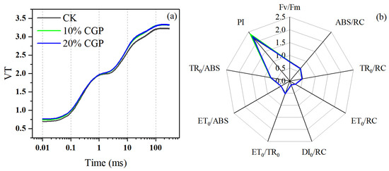 The changes in rapid fluorescence kinetics monitoring of alfalfa leaves under different treatments are shown in Figure 8. The rapid fluorescence kinetics curves of alfalfa under the three treatments did not deform and exhibited a distinct O-J-I-P four-phase pattern. However, compared with the CK group, the relative fluorescence values of the J-I-P segments in the curves of the treatment groups with 10% and 20% CGP addition were higher (Figure 8a). Furthermore, JIP-test analysis was conducted on the rapid fluorescence kinetics curves of each group, and a series of fluorescence parameters reflecting the performance of PSII were calculated (Figure 8b). The values of light energy absorbed by the reaction center (ABS/RC), light energy captured by the reduced plastoquinone A (TR0/RC), energy captured by electron transfer (ET0/RC), and energy dissipated as heat (DI0/RC) did not vary with the treatments (p > 0.05), indicating no difference in the light energy absorption capacity of alfalfa PSII under CGP application. Additionally, in the electron transfer chain, there was no significant difference in the probability of leaf electrons transferring to the electron acceptors downstream of plastoquinone A (ET0/TR0) (p > 0.05). The quantum yield for electron transfer (ET0/ABS) and the maximum quantum efficiency of PSII (TR0/ABS) were at the same level, suggesting that the electron transfer process of PSII remained unchanged. The maximum photochemical efficiency FV/FM of leaves under different treatments was greater than 0.8. Nevertheless, the performance index (PI) of the 10% and 20% CGP treatments was higher than that of CK, implying better PSII activity, electron transfer status, and light energy utilization efficiency.