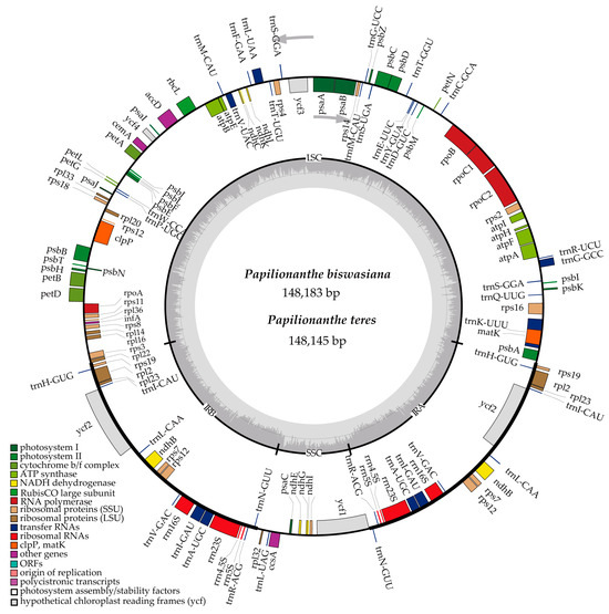 Circular chloroplast genome map of Papilionanthe biswasiana and P. teres. Genes drawn inside and outside of the circle are transcribed in clockwise and counterclockwise directions separately. Darker and lighter gray area in the inner circle corresponds to the GC and AT content, respectively. Genes belonging to different functional groups are color-coded in the outmost circle.