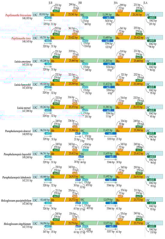 Comparison of the borders of LSC, SSC, and IR regions among two Papilionanthe species and another eight related species.