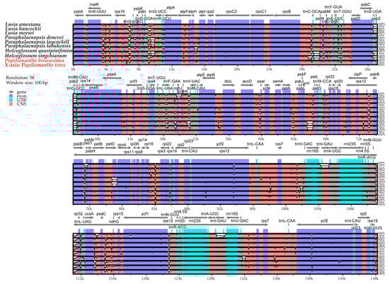 The mVISTA tool in Shuffle–LAGAN mode was employed for pairwise alignments and analyses of sequence divergence between Papilionanthe biswasiana, P. teres, and eight related Aeridinae species (Table S1) [37]. Contraction and extension operations of the IR borders between the four major areas in 10 cp genome sequences were implemented through CPJSdraw v1.0.0, an online application platform [38].