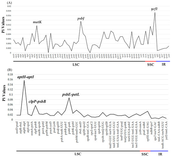 Based on the annotation of the cp genome of Papilionanthe teres as the reference, the cp genome sequences of P. biswasiana and the other eight species from Aeridinae are compared by mVISTA (Figure 3). The nucleotide sequences in non-coding regions emerged with greater divergence than those of coding regions among the 10 cp genomes (Figure 3). Three CDSs exhibit significantly higher Pi values, including matK (0.011675347), ycf1 (0.017386189), and psbJ (0.013550136) (Figure 4A, Table S9). Three locations are found to have high Pi values (>0.05) for the intergenic spacer (IGS), including atpH–atpI (0.15658502), psbE–petL (0.087026207), and clpP–psbB (0.056823555) (Figure 4B, Table S10). CDSs (0.00–0.01, average 0.005004492) exhibit a lower Pi value compared to IGS locations (0.01–0.16, average 0.024585135) (Figure 4, Tables S9 and S10).