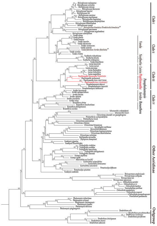 A phylogenetic tree based on complete chloroplast genome data of four individuals of 3 Papilionanthe species and another 99 related species from Aeridinae, with 7 Dendrobium species as outgroup. Papilionanthe species (P. biswasiana and P. teres) highlighted in red were sequenced and assembled here. An asterisk (*) indicates the uncertain species.