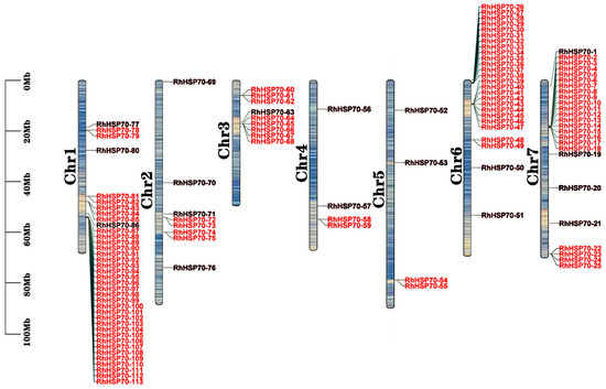 Chromosomal localization of RhHSP70 genes on the R. hybrida genome revealed that the 113 RhHSP70 genes were unevenly distributed on the seven chromosomes with high gene densities (Figure 1). Notably, highest RhHSP70 gene density was observed on chromosome chr1, with 37 genes, while lowest gene densities were detected on chromosomes chr4 and chr5 each with 4 genes.