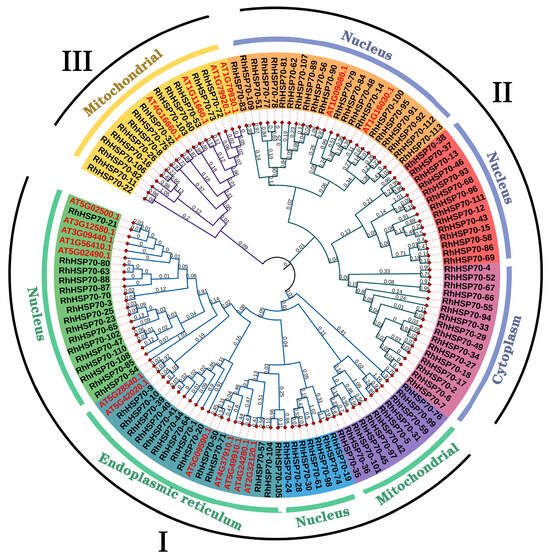 Phylogenetic analysis of hybrid tea rose and Arabidopsis HSP70 proteins. An unrooted neighbour-joining (NJ) phylogenetic tree was constructed with HSP70 domains of HSP70 proteins from hybrid tea rose and Arabidopsis using MEGA7.0 with a bootstrap of 1000. Three major groups are indicated: I, II and III, with subtypes represented by different colored regions.
