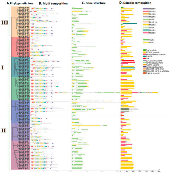 Phylogenetic tree, Motif, gene structure and domain of RhHSP70 in hybrid tea rose: (A) Phylogenetic tree of RhHSP70 protein (B) Motif composition of RhHSP70 (C) Gene structure of RhHSP70 gene (D) Domain composition of RhHSP70 gene in hybrid tea rose.