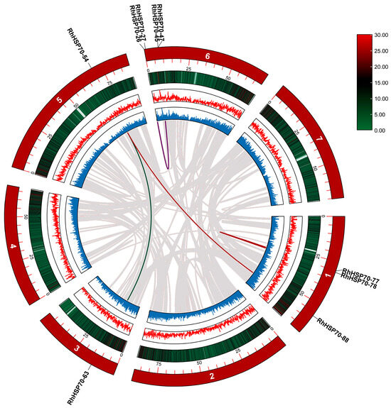 Gene replication of the HSP70 gene family in Rosa hybrida. The colored lines represent replicated gene pairs in RhHSP70, while the gray lines represent collinear gene pairs in the genome.