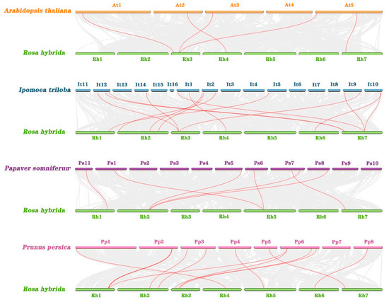 In order to explore the evolutionary relationship between RhHSP70 genes and other species, the genomes of four plants, including A. thaliana, Ipomoea triloba, Papaver somniferum, and Prunus persica were retrieved and their collinearity compared with that of the hybrid tea rose. A total of 5, 14, 7, and 13 segmentally duplicated pairs were observed between R. hybrida and either A. thaliana, I. triloba, P. somniferum, and P. persica, respectively (Figure 6). Notably, numerous collinear pairs were detected between R. hybrida and I. triloba, indicating that the two species are closely related.