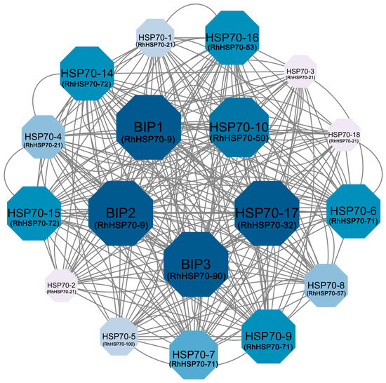 HSP70 protein interaction network in roses, visualized using Cytoscape (v3.10.0) software. The blue ball (node) represents the RhHSP70 gene. The connecting lines represent potential regulatory relationships, and the text displays the predicted gene names. The larger the size and darker the color of the ball, the more it interacts with other proteins.