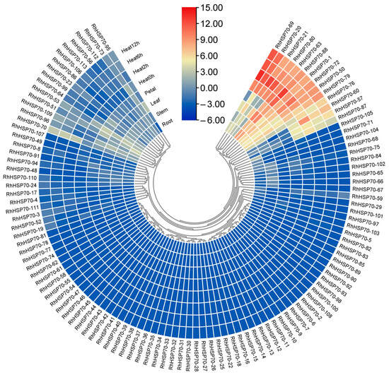Different HSP70 gene family members have varied expression patterns in the organs of different plants. For example, AtHSP70-1 is highly expressed in A. thaliana leaves, while AtHSP70-2 is more actively expressed in roots [8]. In rice, OsHSP70-1, OsHSP70-2, and OsHSP70-3 are more actively expressed in the leaves, stems, and roots, respectively [9]. In this study, expression analysis of RhHSP70 showed obvious differences in the expression patterns of several genes in different organs. For example, RhHSP70-63, RhHSP70-79, and RhHSP70-80 had varying profiles in different tissues, while RhHSP70-1 and RhHSP70-72 exhibited highest expression levels in leaves and petals, respectively.