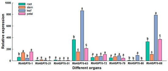 Relative expression levels of eight RhHSP70 genes were determined by qRT-PCR in different rose organs: roots, stem leaf, and petal. Rhactin was used as the internal control for normalization. Data represent the means ± SEs of three reproducible experiments. Bars with lowercase letters above the columns indicate significant differences between the four organs at p < 0.05 (Tukey’s test).