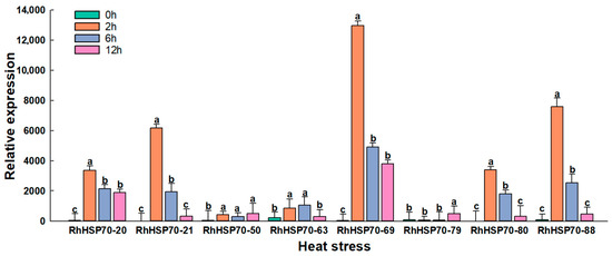 The roles of the above eight RhHSP70 genes in heat stress were determined by detected by profiling their levels under heat stress (Figure 10). Notably, the expression levels of RhHSP70-20, RhHSP70-21, RhHSP70-69, RhHSP70-80, and RhHSP70-88 were rapidly induced and peaked within 2 h, while the expression levels of RhHSP70-69 and RhHSP70-88 showed a sudden 50-fold increase, suggesting their likely crucial roles in the plant heat stress response. In contrast, RhHSP70-79 showed a slow increase in expression, which significantly increased at 12 h relative to the levels at 0 h.