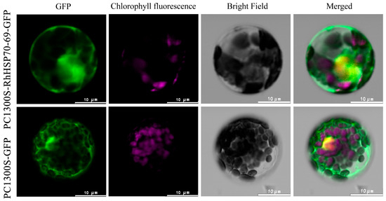 Subcellular localization of RhHSP70-69 protein in Arabidopsis protoplasts. From left to right are GFP green fluorescent protein, chlorophyll fluorescence, bright field, and merged overlay photos (scale bar = 10 µm).