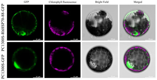 Subcellular localization of RhHSP70-88 protein in Arabidopsis protoplasts. From left to right are GFP green fluorescent protein, chlorophyll fluorescence, bright field, and merged overlay photos (scale bar = 10 µm).
