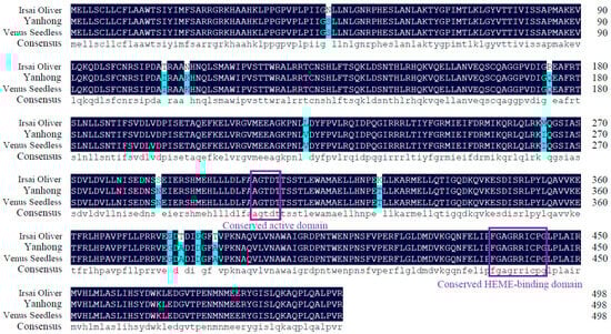 Amino acid sequence alignment of CYP76F14 proteins from the three distinct flavor type table grape cultivars.
