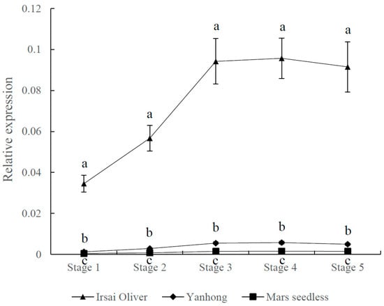 Expression analysis of CYP76F14 genes during the different fruit developmental stages. Stage 1, cell division phase. Stage 2, seed hardening phase. Stage 3, veraison phage. Stage 4, post-veraison (cell expansion phase). Stage 5, mature phase. Data were presented as the means ± SE (n = 3). Letters represent significant differences among the different flavor type cultivars at a significance level of p ≤ 0.01, as determined using ANOVA followed by Fisher’s LSD test.