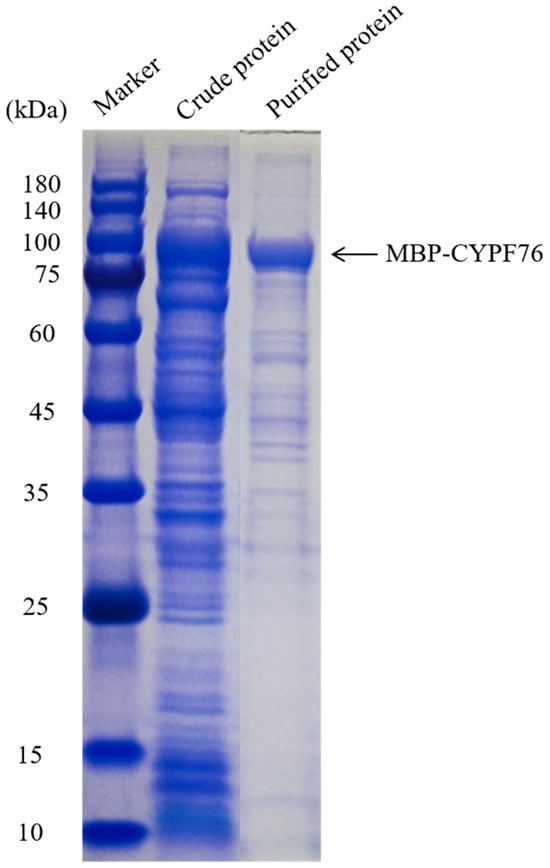 The CYP76F14 gene from the Muscat type ‘Irsai Oliver’ berries was cloned, and 12 site-directed mutant proteins (CYP76F14-SMs: CYP76F14-N46S, CYP76F14-T107R, CYP76F14-N111K, CYP76F14-R175Q, CYP76F14-L222V, CYP76F14-M264I, CYP76F14-S286N, CYP76F14-K325T, CYP76F14-E378G, CYP76F14-T380A, CYP76F14-E383G, and CYP76F14-T386A) were obtained and sequenced. The recombinant plasmids of pMAL-c6T-CYP76F14 or pMAL-c6T-CYP76F14-SMs were transformed into E. coli BL21 strains for expression and purification. The resulting CYP76F14-MBP recombinant proteins were subsequently used for the in vitro enzyme activity assays. The expression and purification of the CYP76F14-MBP recombinant proteins is exhibited in Figure 3.