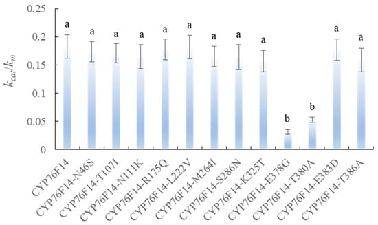 According to the method described by Peng et al. [] and Xia et al. [], using linalool as the substrate, the purified recombinant enzymes CYP76F14-MBP or CYP76F14-SMs-MBP were subjected to the in vitro enzyme activity assays. The enzymatic kinetic analysis results showed that the enzyme activities of the CYP76F14-E378G and CYP76F14-T380A site-directed mutant proteins were significantly lower than those of the control protein CYP76F14. However, there were no significant differences in the enzyme activities of the other 10 amino acid residue site-directed mutant proteins CYP76F14-SMs (CYP76F14-N46S, CYP76F14-T107R, CYP76F14-N111K, CYP76F14-R175Q, CYP76F14-L222V, CYP76F14-M264I, CYP76F14-S286N, CYP76F14-K325T, CYP76F14-E383G, and CYP76F14-T386A) compared to the control protein (Figure 4 and Table 2).