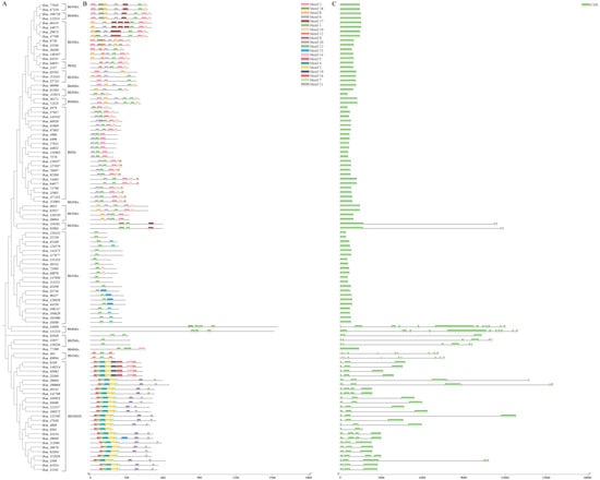 Phylogenetic relationships, motifs, and gene structures of BbZFP family members. (A) A phylogenetic tree of 105 BbZFP proteins was constructed using the maximum likelihood method. (B) Conserved motifs of BbZFP proteins. Different motifs are represented by various colored boxes. (C) Gene structures of BbZFP genes. Exon(s) and intron(s) are represented by green boxes and black lines, respectively. The phylogenetic tree, conserved motifs, and gene structures were predicted using TBtools.