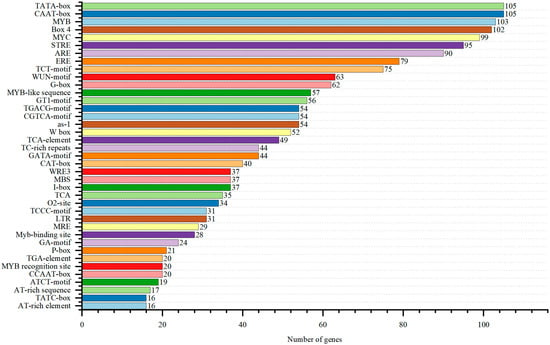 The number of BbZFP promoters containing various cis-acting elements. Different colors represent different cis-element types. The numbers above the columns represent the number of promoters.