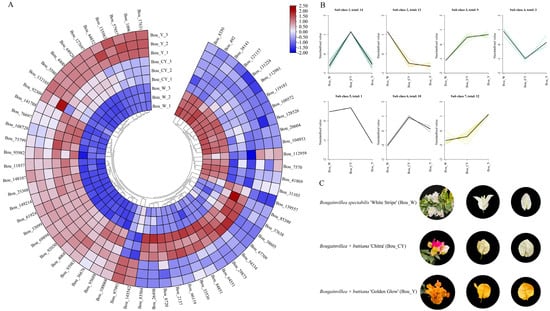 Expression analysis of BbZFP genes in yellow bracts based on RNA-seq. (A) Hierarchical clustering of BbZFP genes expression profiles across different colored bracts. The different colors correspond to the log2-transformed fold change with blue and red indicating down- and upregulation, respectively. (B) K-means analysis of BbZFP genes shown in (A). (C) Materials used in (A). Bou_Y: ‘Golden Glow’; Bou_CY: ‘Chitra’canary yellow bract; Bou_W: ‘White Stripe’.