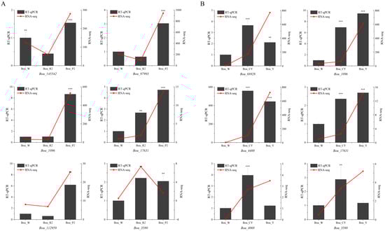 RT-qPCR validation of the differentially expressed genes. (A) RT-qPCR validation of the differentially expressed genes in the red-purple group. (B) RT-qPCR validation of the differentially expressed genes in the yellow group. The Y axis on the left represents the values of RT-qPCR, while the Y axis on the right represents the values of RNA-seq. Error bars indicated the standard deviation of three independent replicates. Asterisks (** or ***) indicate a significant difference at p < 0.01 or p < 0.001, respectively. Bou_W: ‘White Stripe’; Bou_Y: ‘Golden Glow’; Bou_CY: ‘Chitra’canary yellow bract; Bou_R2: ‘Chitra’ red bract; Bou_P2: ‘Elizabeth Angus’.