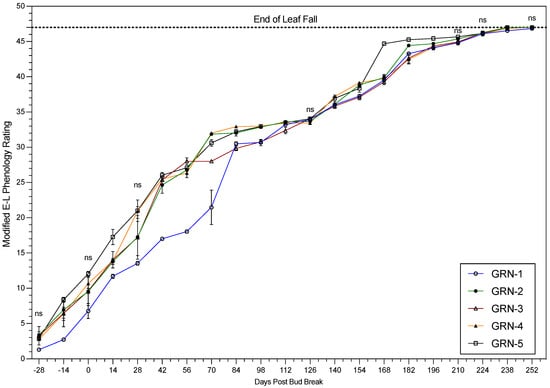 Phenology ratings of ungrafted GRN rootstocks in the 2022 growing season. One-way analysis of variance (ANOVA) displaying rootstock mean values followed by the standard error of the mean (n = 3). The letters “ns” signify the lack of significant differences based on a Fisher’s LSD test (p < 0.05).
