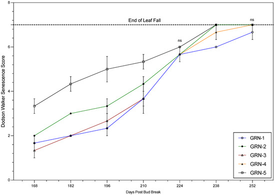 Senescence scores of ungrafted rootstocks during the 2022 growing season. One-way analysis of variance (ANOVA) displaying rootstock mean values, with standard error bars (n = 3). The letters “ns” signify the lack of significant differences from each other based on a Fisher’s LSD test (p < 0.05).