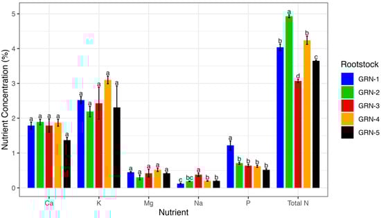 One-way analysis of variance (ANOVA), displaying average macronutrient concentrations (% dry weight) of ungrafted GRN rootstocks at bloom during the 2022 growing season. Bars represent rootstock means, with error bars indicating the standard error of the mean (n = 3). Different letters above bars indicate significant differences among rootstocks within each macronutrient based on a Fisher’s LSD test (p < 0.05).
